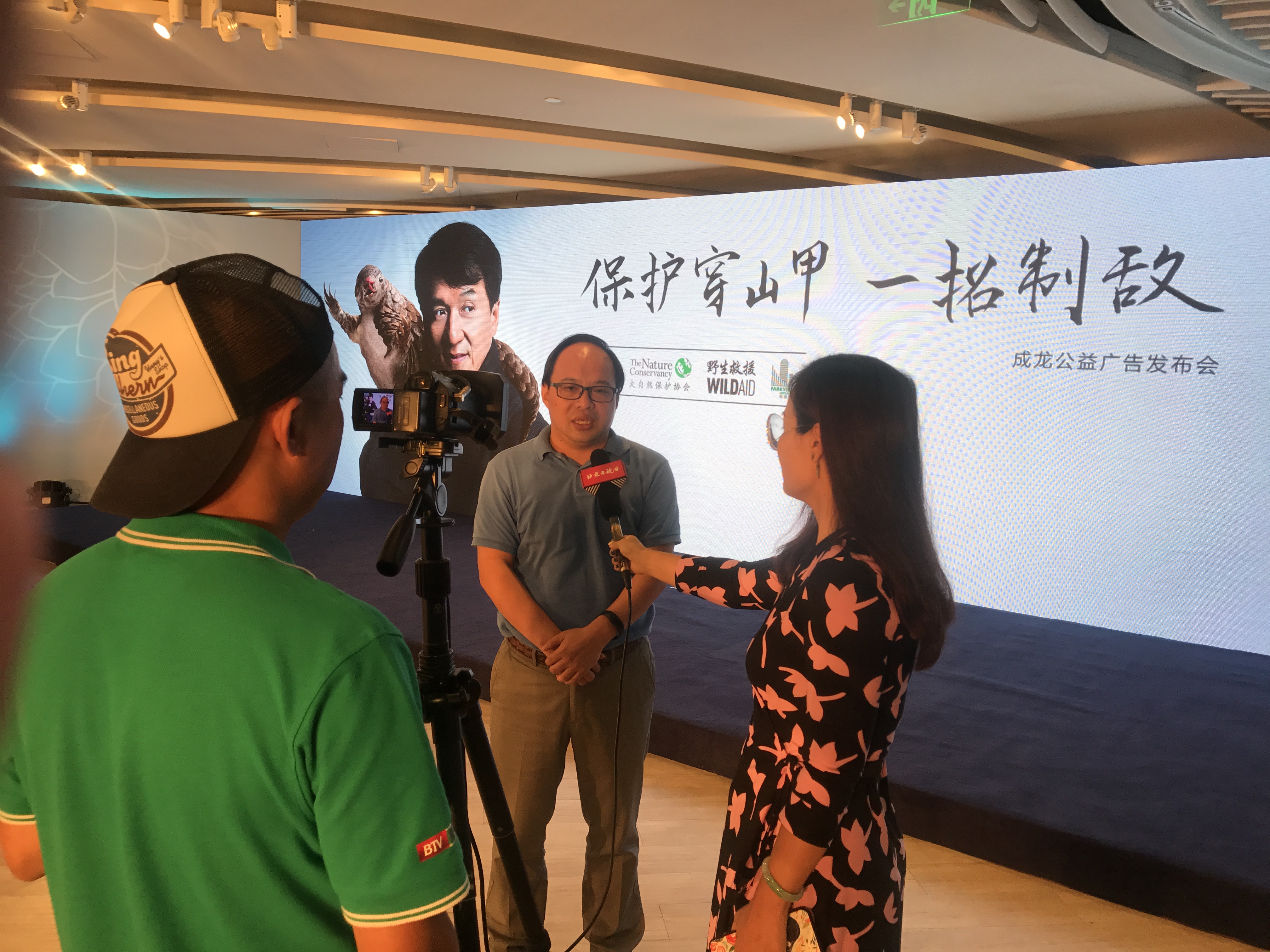 尹峰在《保护穿山甲一招致敌》成龙公益广告发布会上接受媒体采访