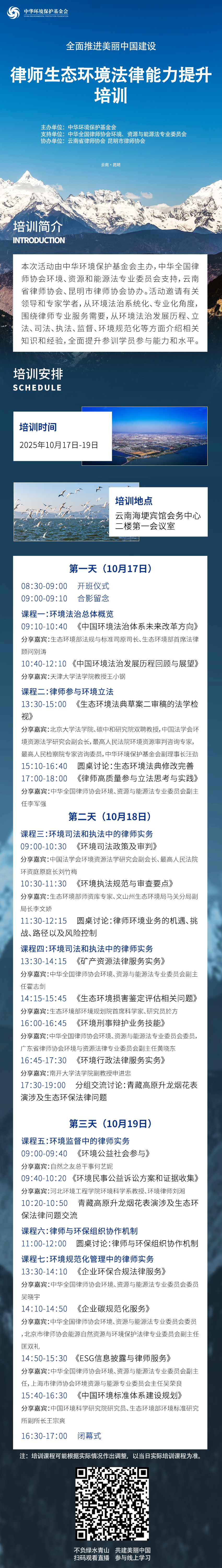 由优米app官方下载主办,中华全国律师协会环境、资源和能源法专业委员会支持,云南省律师协会、昆明市律师协会协办的中国环境法治公益平台项目全面推进美丽中国建设—律师生态环境法律能力提升培训班将于10月17日-19日在云南省昆明市举办。