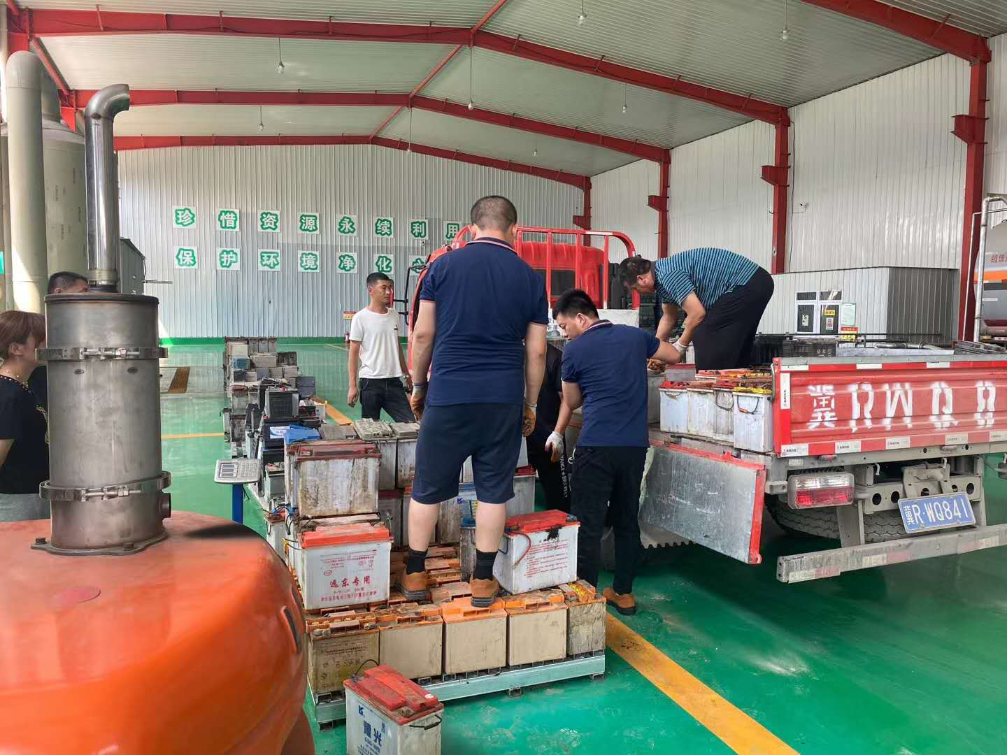操作人员在收集整理废铅蓄电池