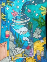 薛紫涵小朋友,通过这次活动了解到许多海洋知识,意识到保护海洋的重要性。作品中两只美丽的蓝鲸为了生存,不得不藏在玻璃罐里躲避海洋垃圾,从而失去了在海中畅游的自由。他希望通过作品倡导减少海洋垃圾,让海洋生物有一个更干净的生活环境。