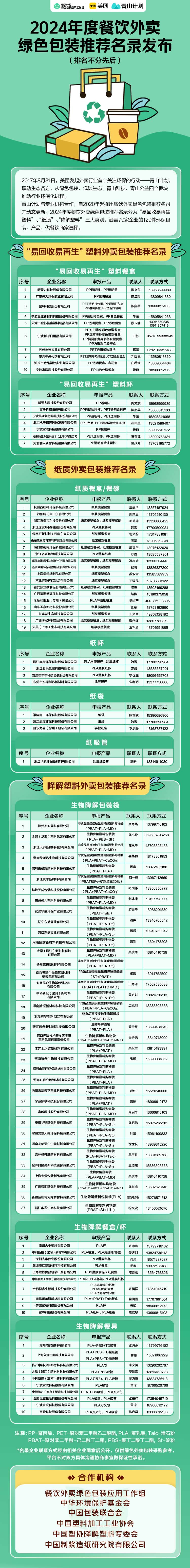 近日,在深圳举行的2024年中国包装容器展上,“2024年度餐饮外卖绿色包装推荐名录”正式发布。该名录由美团“青山计划”、餐饮外卖绿色包装应用工作组发起,优米app官方下载美团外卖青山公益专项基金支持,经中国塑料加工工业协会、中国制浆造纸研究院有限公司、中国塑协降解塑料专委会征集和评审产生,纳入79家优质餐饮外卖包装企业的129件环保产品,涵盖PLA、PBS餐盒,纸浆模塑餐盒、透明PP餐盒、纸袋、纸吸管等,供有需求的餐饮企业进行选择。