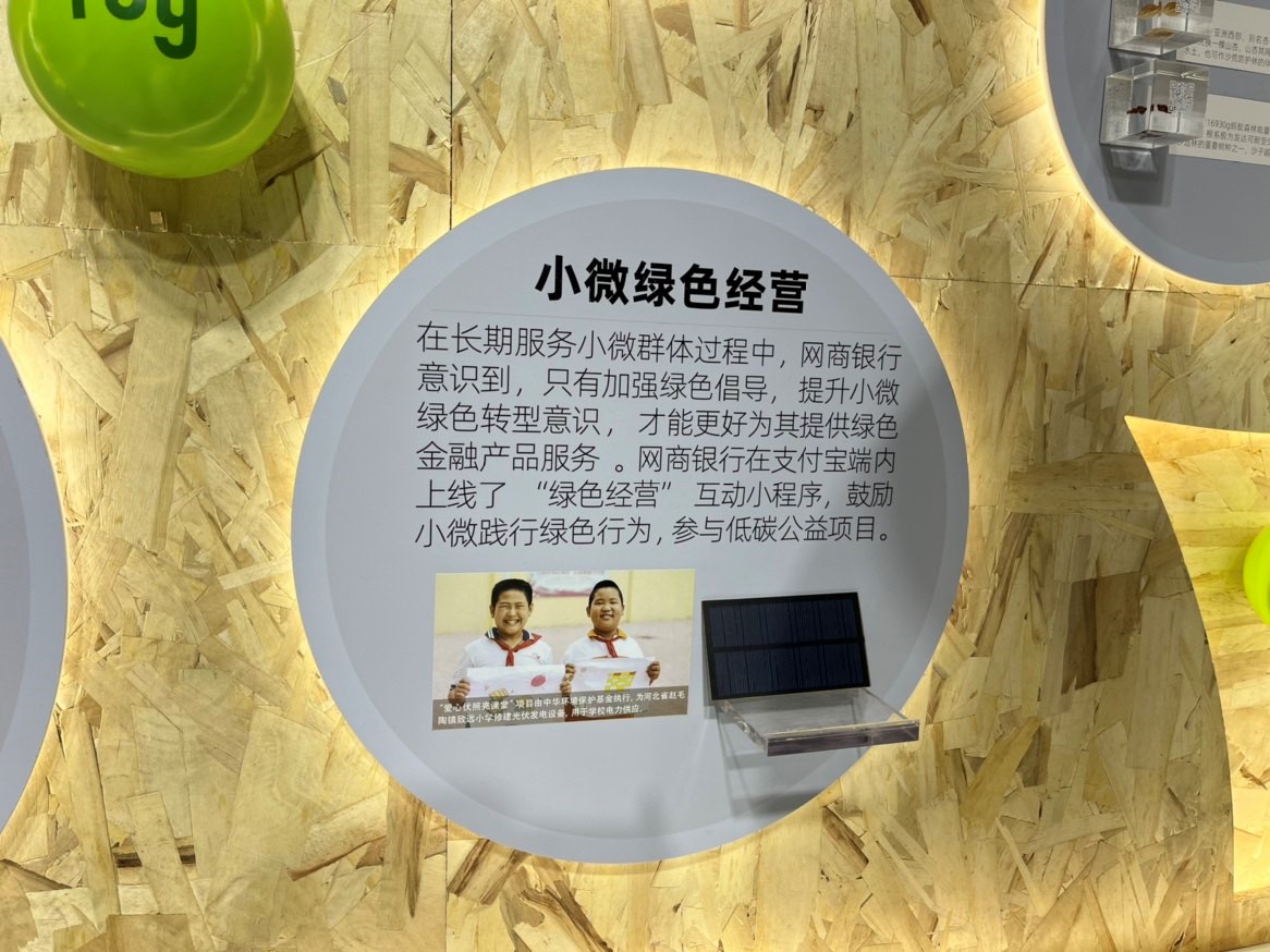 现场展出的光伏板实物模型板吸引了不少参观者驻足,解说人员向大家介绍了低碳校园项目的背景。相比大中型企业,尽管小微群体在生产经营过程中具有污染排放量小、环境风险低等特征;但作为经济的“毛细血管”,小微具有覆盖区域广,服务、就业人口多和环境效益积少成多的特征。小微群体积极参与低碳发展,对我国实现“双碳”目标意义重大。然而,网商银行在实地调研走访和长期为小微商家服务过程中发现,相当一部分小微经营者当前对碳减排的认知还比较模糊。网商银行是本次低碳公益项目的实际出资方,希望通过邀请小微群体参与到低碳公益项目捐赠中来,提升小微自身低碳转型发展意识。只有让他们切实地感知到低碳行为发生在生产经营活动的方方面面,才能更好地调动他们低碳转型积极性并为他们提供绿色金融支持。
