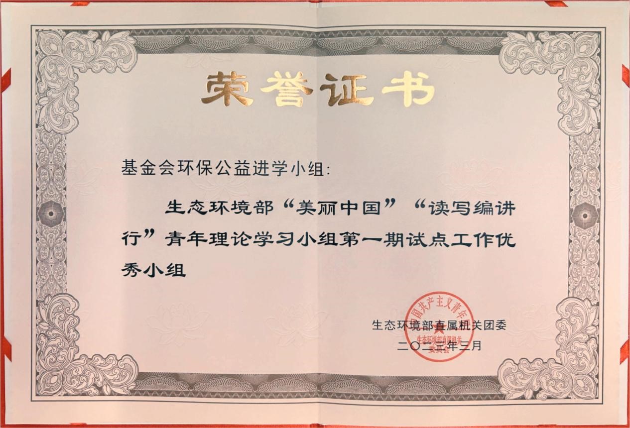 在生态环境部直属机关团委组织的“美丽中国”“读写编讲行”青年理论学习小组第一期试点工作中,我会荣获优秀小组荣誉证书。